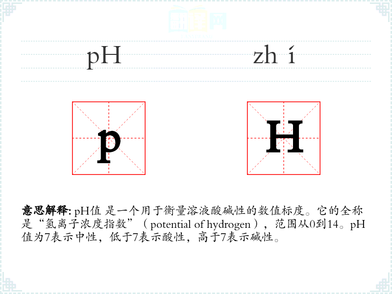 pH值 是一个用于衡量溶液酸碱性的数值标度。它的全称是“氢离子浓度指数”(potential of hydrogen),范围从0到14。pH值为7表示中性,低于7表示酸性,高于7表示碱性。