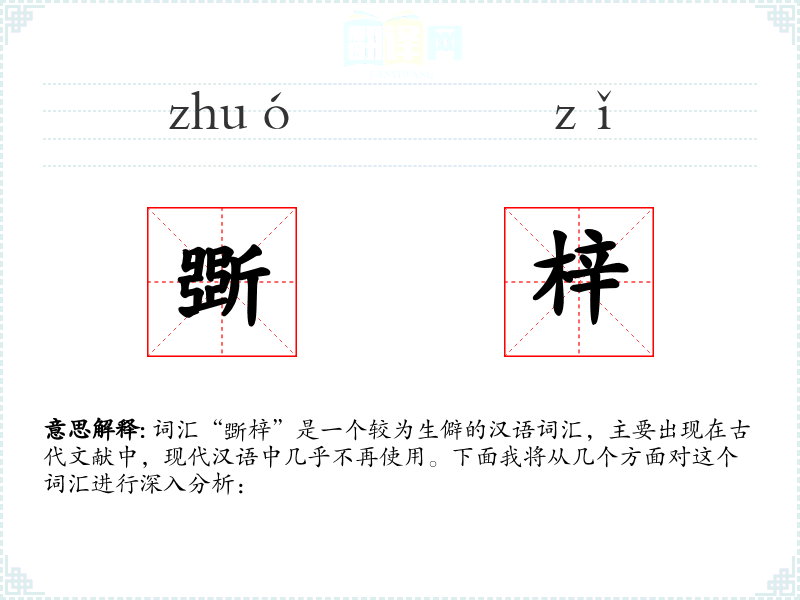 词汇“斲梓”是一个较为生僻的汉语词汇,主要出现在古代文献中,现代汉语中几乎不再使用。下面我将从几个方面对这个词汇进行深入分析: