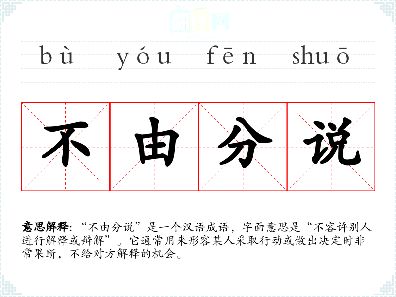 “不由分说”是一个汉语成语,字面意思是“不容许别人进行解释或辩解”。它通常用来形容某人采取行动或做出决定时非常果断,不给对方解释的机会。