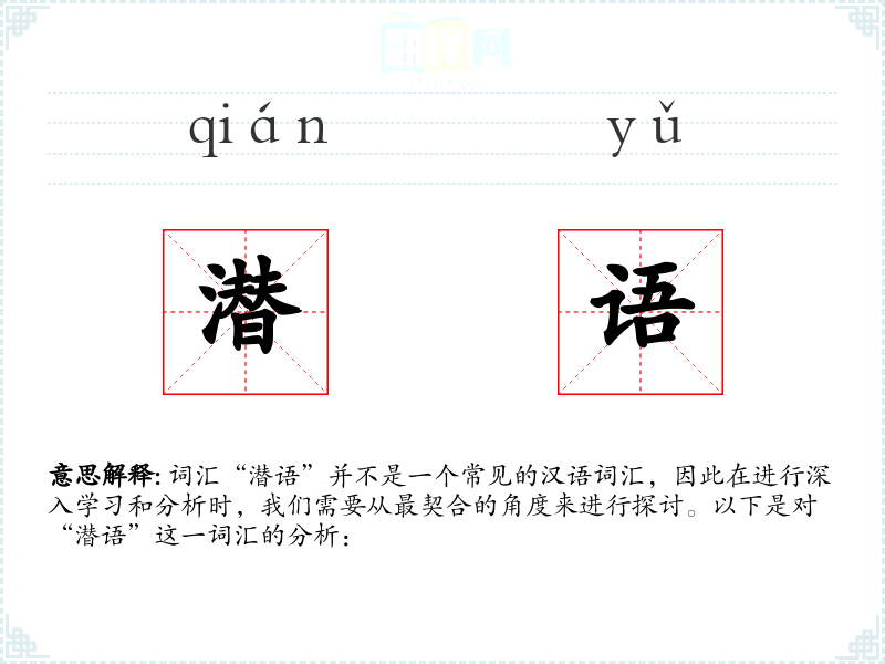 词汇“潜语”并不是一个常见的汉语词汇,因此在进行深入学习和分析时,我们需要从最契合的角度来进行探讨。以下是对“潜语”这一词汇的分析: