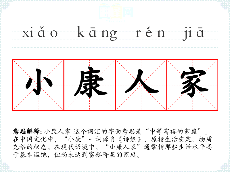 小康人家 这个词汇的字面意思是“中等富裕的家庭”。在**文化中,“小康”一词源自《诗经》,原指生活安定、物质充裕的状态。在现代语境中,“小康人家”通常指那些生活水平高于基本温饱,但尚未达到富裕阶层的家庭。