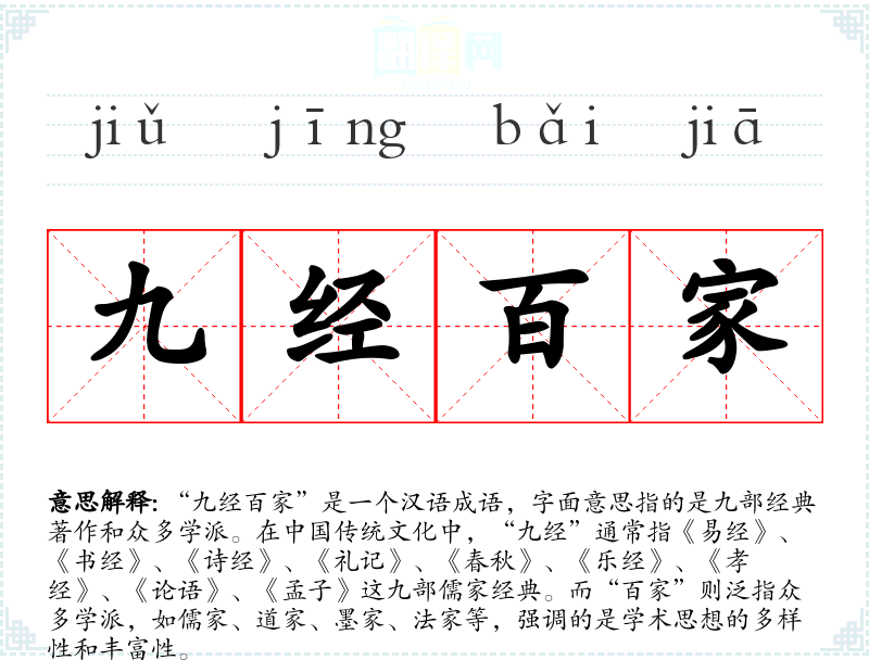“九经百家”是一个汉语成语,字面意思指的是九部经典著作和众多学派。在**传统文化中,“九经”通常指《易经》、《书经》、《诗经》、《礼记》、《春秋》、《乐经》、《孝经》、《论语》、《孟子》这九部儒家经典。而“百家”则泛指众多学派,如儒家、道家、墨家、法家等,强调的是学术思想的多样性和丰富性。