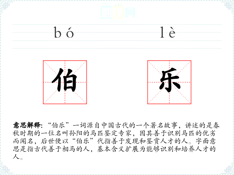 “伯乐”一词源自**古代的一个著名故事,讲述的是春秋时期的一位名叫孙阳的马匹鉴定专家,因其善于识别马匹的优劣而闻名,后世便以“伯乐”代指善于发现和鉴赏人才的人。字面意思是指古代善于相马的人,基本含义扩展为能够识别和培养人才的人。
