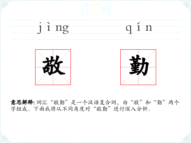 词汇“敬勤”是一个汉语复合词,由“敬”和“勤”两个字组成。下面我将从不同角度对“敬勤”进行深入分析。