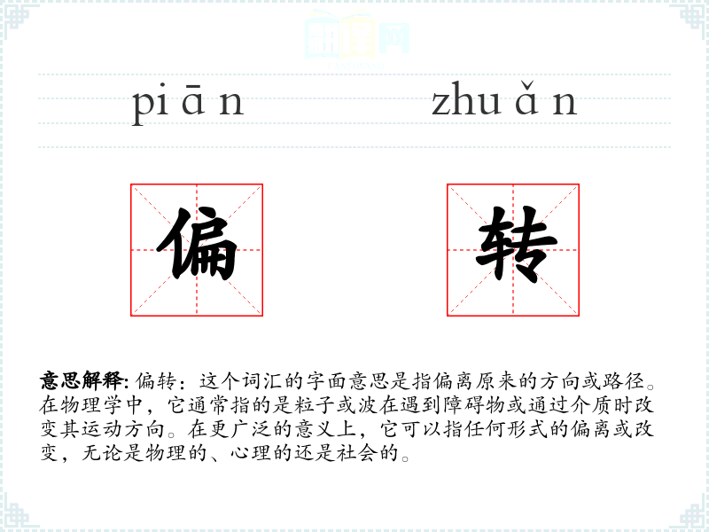 - 专业领域:在物理学、航空学和电子工程等领域,“偏转”有特定的技术含义,涉及到力、电场、磁场等对物体**方向的影响。