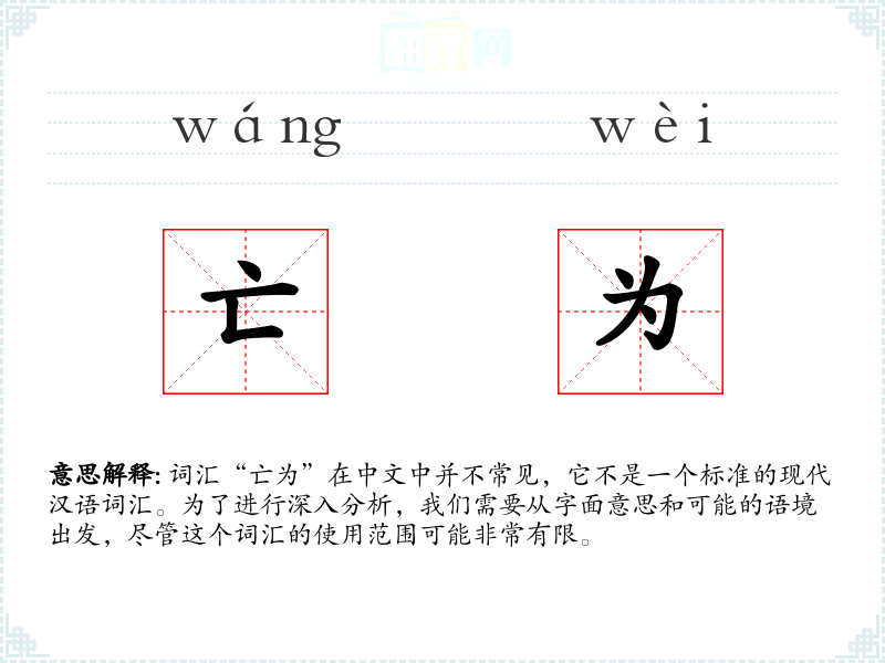 由于“亡为”不是一个常用词汇,它在现代文学、口语或专业领域中的使用非常有限。在古代文献中,可能会有特定的用法,但需要具体文本支持。