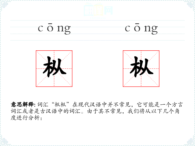 词汇“枞枞”在现代汉语中并不常见,它可能是一个方言词汇或者是古汉语中的词汇。由于其不常见,我们将从以下几个角度进行分析: