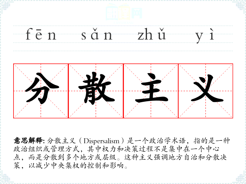 - 反义词:集权主义(Centralism)、集中化(Centralization)