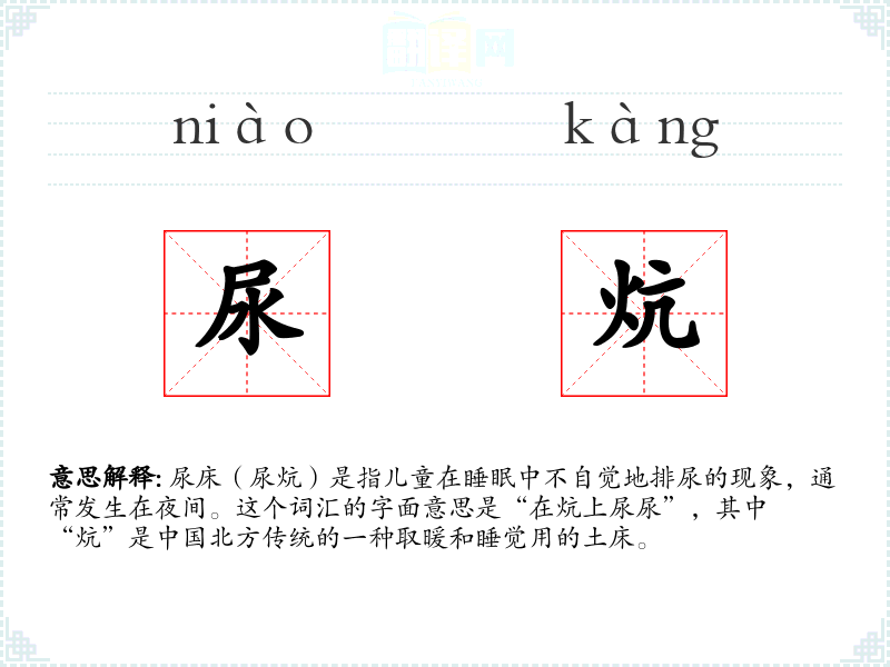 尿床(尿炕)是指儿童在睡眠中不自觉地排尿的现象,通常发生在夜间。这个词汇的字面意思是“在炕上尿尿”,其中“炕”是**北方传统的一种取暖和睡觉用的土床。