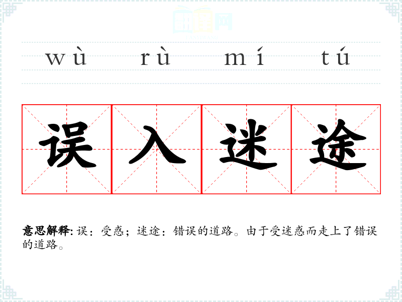 误:受惑;迷途:错误的道路。由于受迷惑而走上了错误的道路。