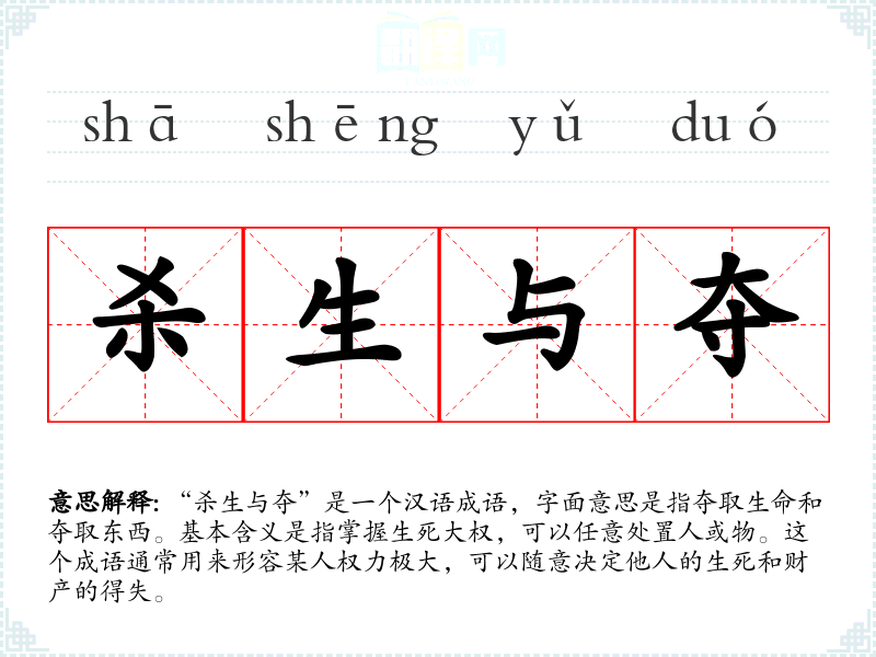 “杀生与夺”是一个汉语成语,字面意思是指夺取生命和夺取东西。基本含义是指掌握生死大权,可以任意处置人或物。这个成语通常用来形容某人权力极大,可以随意决定他人的生死和财产的得失。