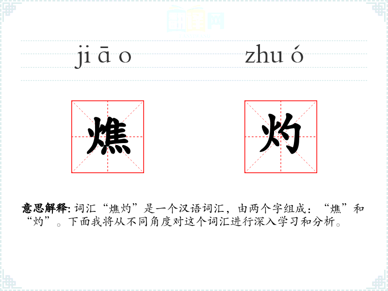 - 词源:“燋”和“灼”都是古代汉语词汇,源自古代对火的描述。