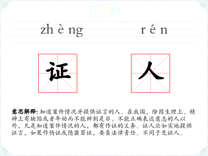 1.知道案件情况并提供证言的人。在我国,除因生理上、精神上有缺陷或者年幼而不能辨别是非、不能正确表达意志的人以外,凡是知道案件情况的人,都有作证的义务。证人应如实地提供证言,如果作伪证或隐匿罪证,要负法律责任。不同于见证人。