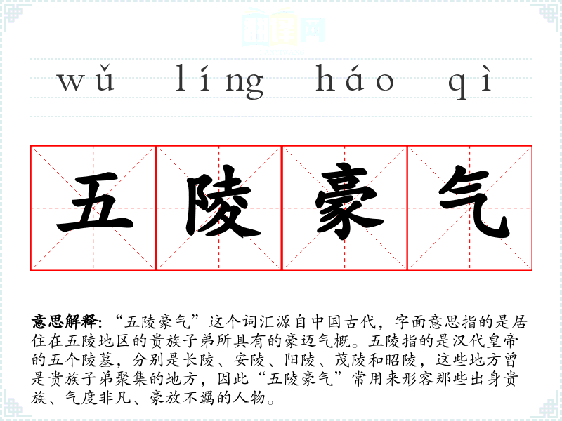 “五陵豪气”的词源直接关联到汉代的五陵地区,随着时间的推移,这个词汇逐渐被用来泛指所有具有贵族气质和豪迈性格的人。在语言的演变中,它从一个具体的地理和文化背景词汇,变成了一个更广泛的性格描述词汇。