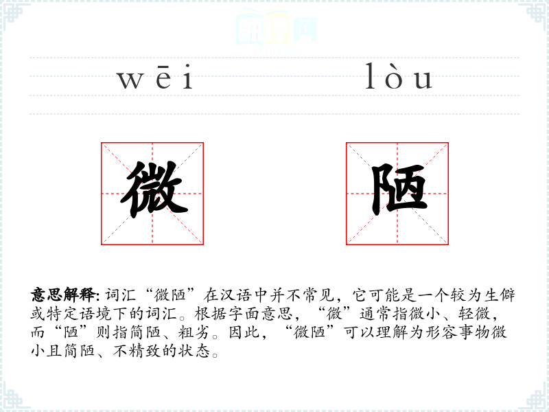 词汇“微陋”在汉语中并不常见,它可能是一个较为生僻或特定语境下的词汇。根据字面意思,“微”通常指微小、轻微,而“陋”则指简陋、粗劣。因此,“微陋”可以理解为形容事物微小且简陋、不精致的状态。