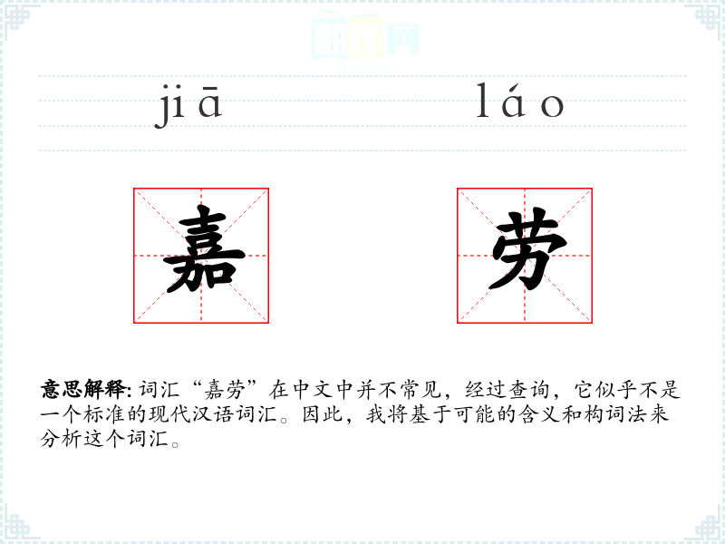 词汇“嘉劳”在中文中并不常见,经过查询,它似乎不是一个标准的现代汉语词汇。因此,我将基于可能的含义和构词法来分析这个词汇。