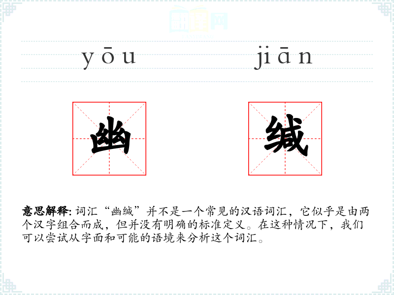 词汇“幽缄”并不是一个常见的汉语词汇,它似乎是由两个汉字组合而成,但并没有明确的标准定义。在这种情况下,我们可以尝试从字面和可能的语境来分析这个词汇。