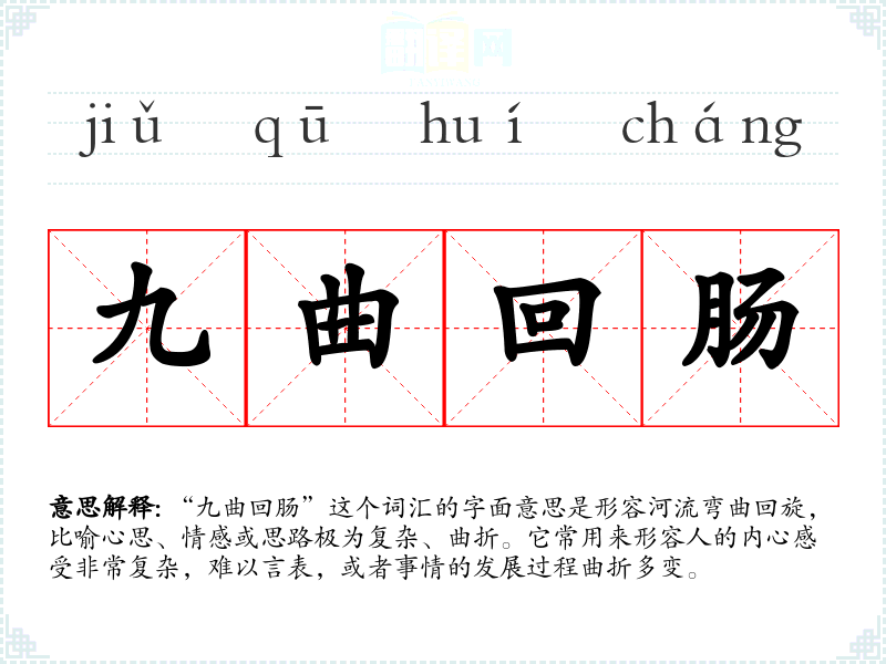 “九曲回肠”这个词汇的字面意思是形容河流弯曲回旋,比喻心思、情感或思路极为复杂、曲折。它常用来形容人的内心感受非常复杂,难以言表,或者事情的发展过程曲折多变。