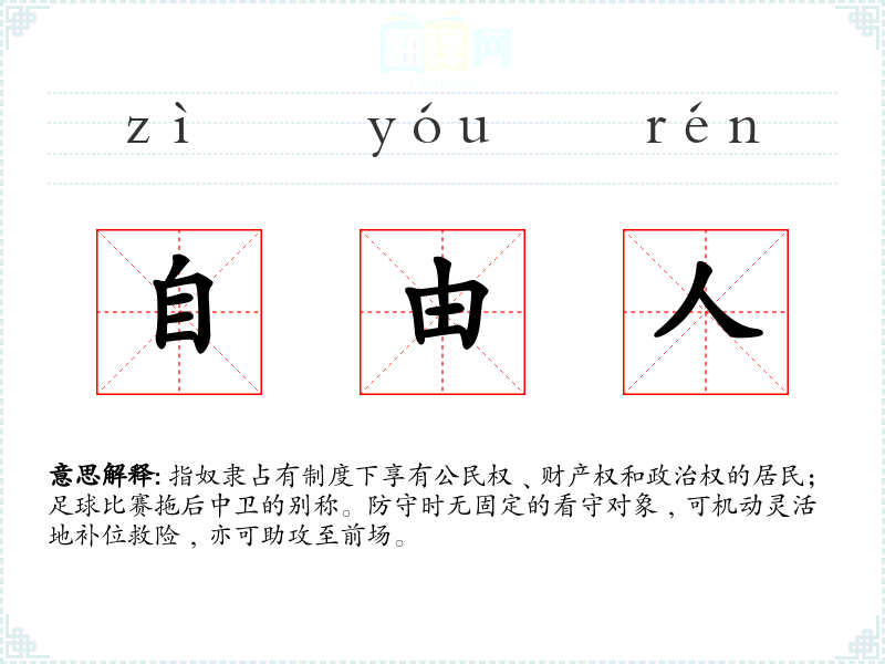 指奴隶占有制度下享有公民权﹑财产权和政治权的居民; 足球比赛拖后中卫的别称。防守时无固定的看守对象﹐可机动灵活地补位救险﹐亦可助攻至前场。