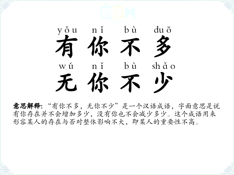 “有你不多,无你不少”是一个汉语成语,字面意思是说有你存在并不会增加多少,没有你也不会减少多少。这个成语用来形容某人的存在与否对整体影响不大,即某人的重要性不高。