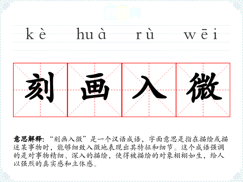 “刻画入微”是一个汉语成语,字面意思是指在描绘或描述某事物时,能够细致入微地表现出其特征和细节。这个成语强调的是对事物精细、深入的描绘,使得被描绘的对象栩栩如生,给人以强烈的真实感和立体感。