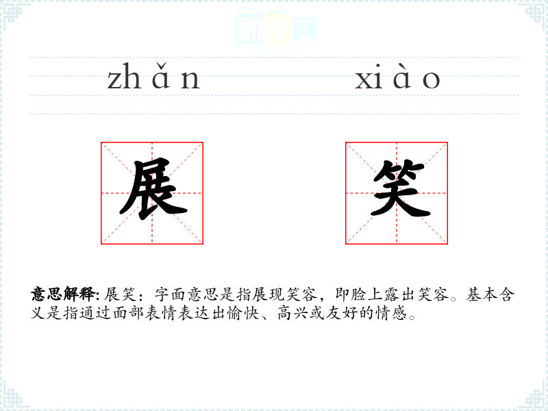展笑:字面意思是指展现笑容,即脸上露出笑容。基本含义是指通过面部表情表达出愉快、高兴或友好的情感。