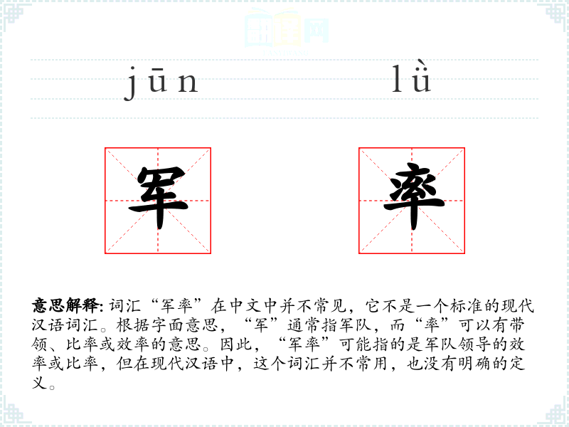 词汇“军率”在中文中并不常见,它不是一个标准的现代汉语词汇。根据字面意思,“军”通常指军队,而“率”可以有带领、比率或效率的意思。因此,“军率”可能指的是军队领导的效率或比率,但在现代汉语中,这个词汇并不常用,也没有明确的定义。