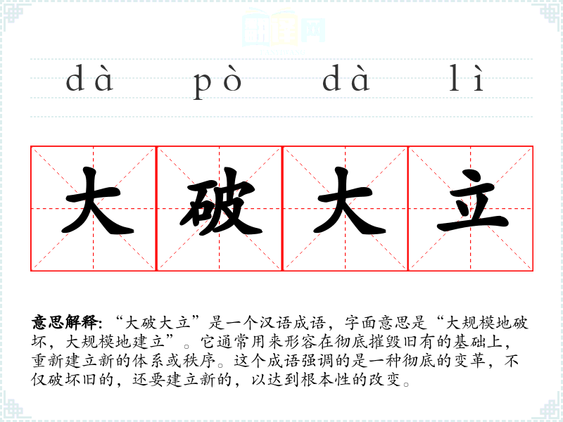 在英语中,类似的表达可能是“break the old to make the new”或“destroy to create”,虽然不如“大破大立”那样简洁有力,但也传达了类似的彻底变革的意味。