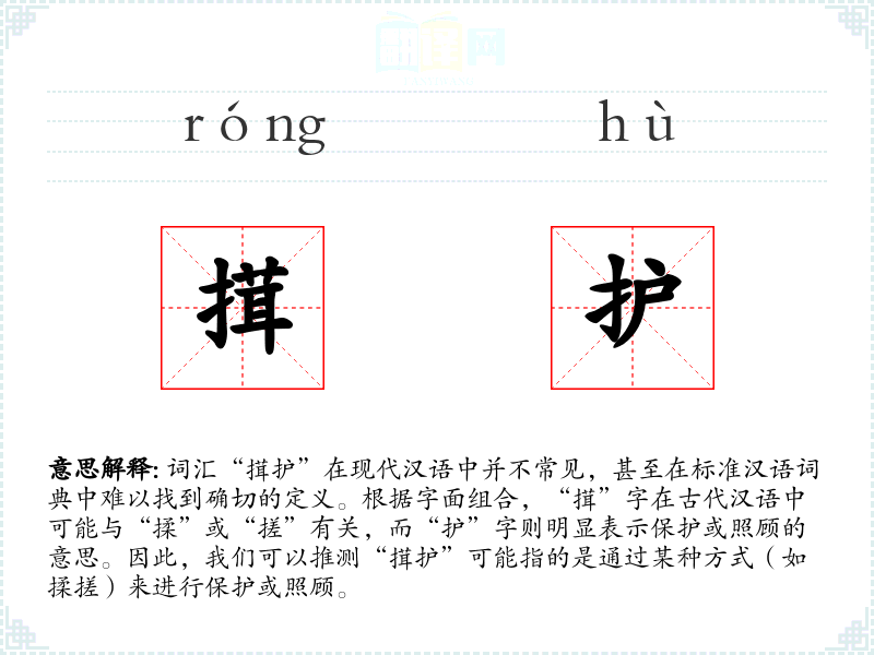 词汇“搑护”在现代汉语中并不常见,甚至在标准汉语词典中难以找到确切的定义。根据字面组合,“搑”字在古代汉语中可能与“揉”或“搓”有关,而“护”字则明显表示保护或照顾的意思。因此,我们可以推测“搑护”可能指的是通过某种方式(如揉搓)来进行保护或照顾。