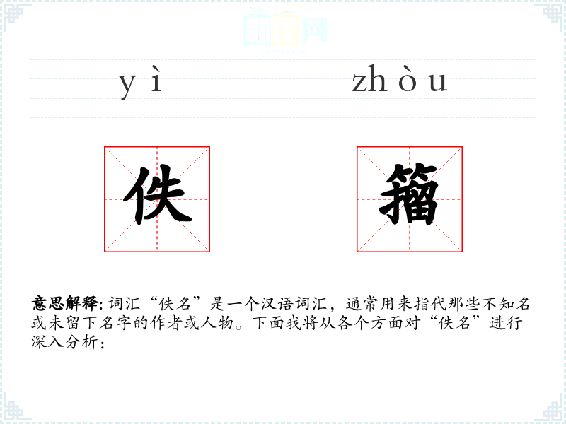 在英语中,“佚名”对应的是“anonymous”,这个词在西方文化中同样用来指代不知名的作者或人物。