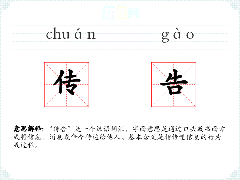 “传告”是一个汉语词汇,字面意思是通过口头或书面方式将信息、消息或命令传达给他人。基本含义是指传递信息的行为或过程。