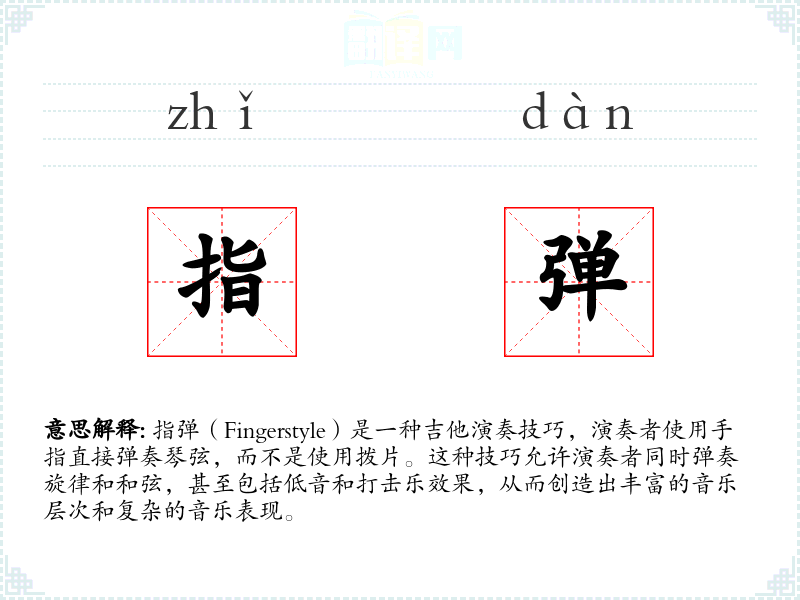 - 同义词:Fingerpicking(指拨),两者都指使用手指弹奏吉他的技巧,但指弹更强调技巧的复杂性和音乐性。