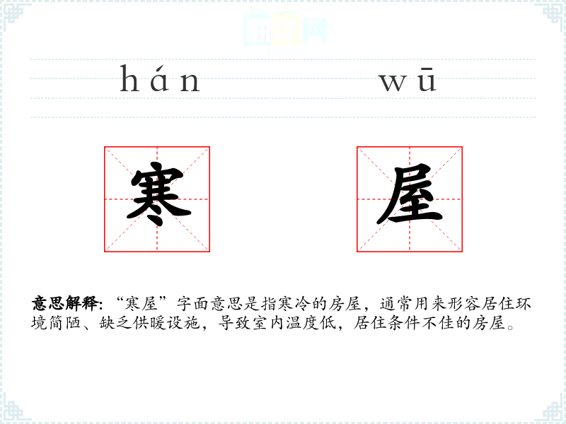 “寒屋”这个词由“寒”和“屋”两个字组成。在古代汉语中,“寒”指的是冷,而“屋”指的是居住的建筑物。随着时间的推移,这个词的含义基本保持不变,但在不同的文学作品和社会环境中,其象征意义有所扩展。
