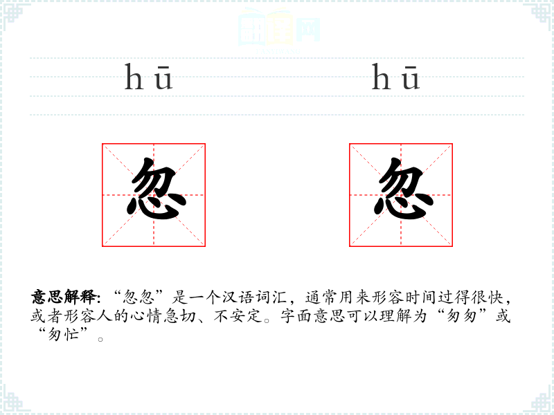 - 文学:在文学作品中,“忽忽”常用来形容时间的流逝,如“岁月忽忽”。