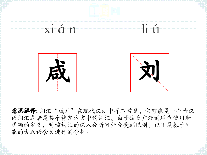 词汇“咸刘”在现代汉语中并不常见,它可能是一个古汉语词汇或者是某个特定方言中的词汇。由于缺乏广泛的现代使用和明确的定义,对该词汇的深入分析可能会受到限制。以下是基于可能的古汉语含义进行的分析:
