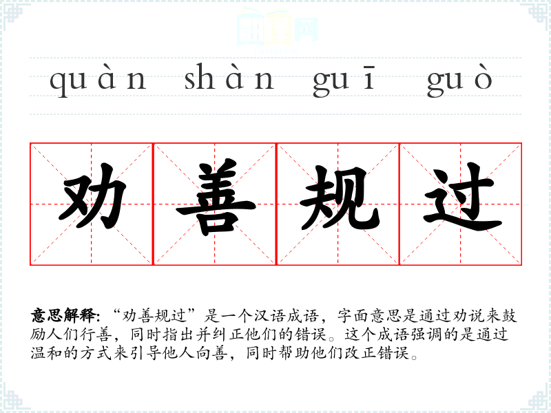 “劝善规过”是一个汉语成语,字面意思是通过劝说来鼓励人们行善,同时指出并纠正他们的错误。这个成语强调的是通过温和的方式来引导他人向善,同时帮助他们改正错误。