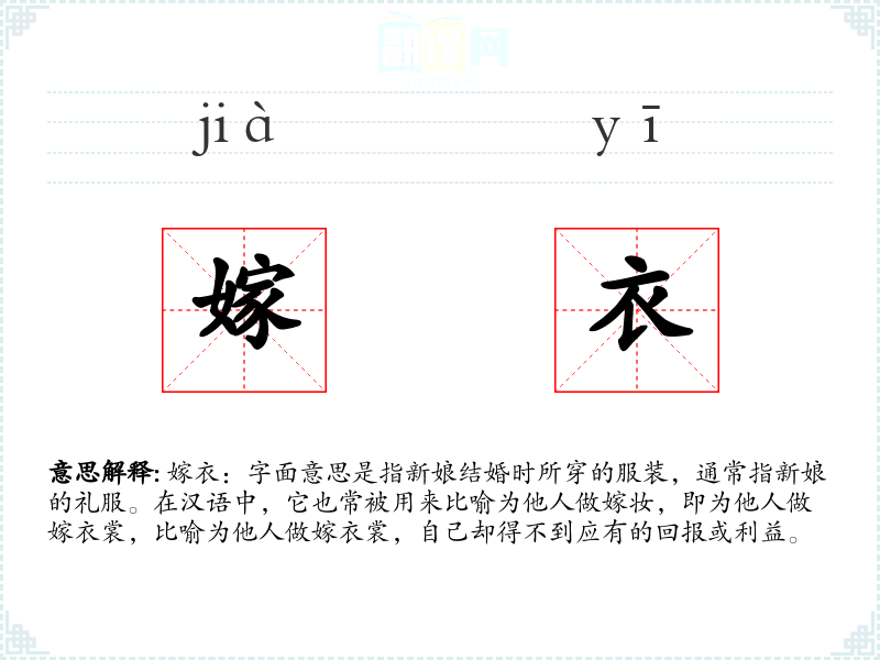嫁衣:字面意思是指新娘结婚时所穿的服装,通常指新娘的礼服。在汉语中,它也常被用来比喻为他人做嫁妆,即为他人做嫁衣裳,比喻为他人做嫁衣裳,自己却得不到应有的回报或利益。