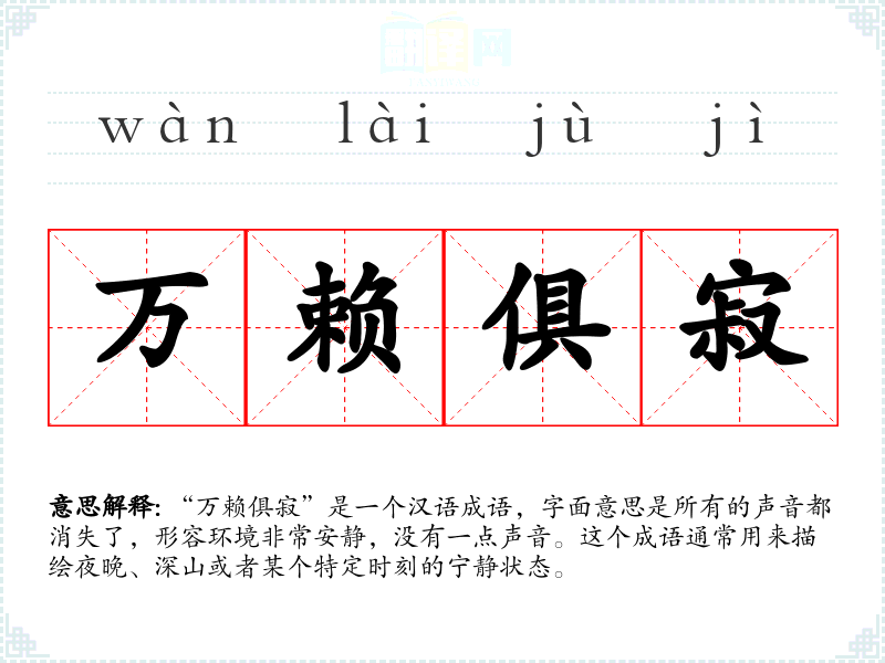 “万赖俱寂”是一个汉语成语,字面意思是所有的声音都消失了,形容环境非常安静,没有一点声音。这个成语通常用来描绘夜晚、深山或者某个特定时刻的宁静状态。