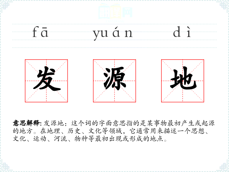 “发源地”一词由“发源”和“地”组成。“发源”指的是开始流出或产生,而“地”指的是地点。这个词在中文中的使用历史悠久,主要用于描述自然和文化的起源。