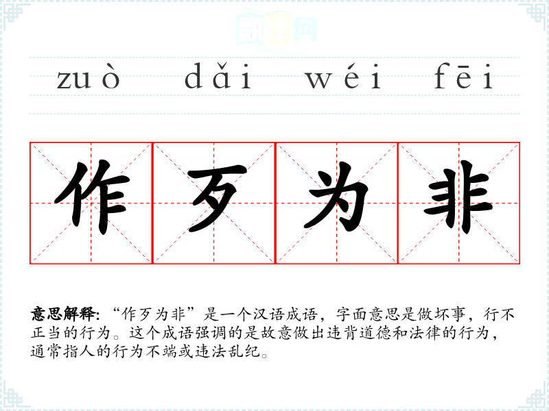 “作歹为非”是一个汉语成语,字面意思是做坏事,行不正当的行为。这个成语强调的是故意做出违背道德和法律的行为,通常指人的行为不端或违法乱纪。