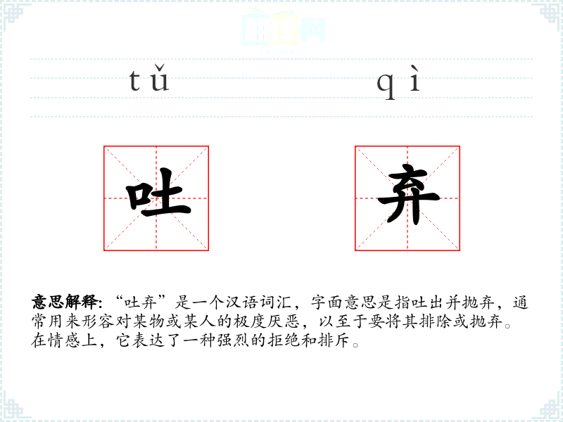 - 文学:在文学作品中,“吐弃”常用来形容人物对某种观念、行为或物品的极端反感,如“他对旧社会的陋习吐弃不已”。