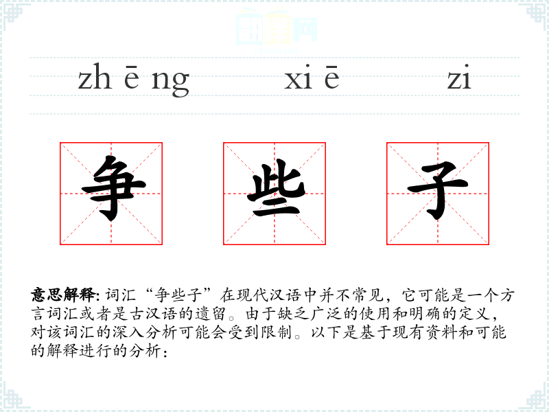 词汇“争些子”在现代汉语中并不常见,它可能是一个方言词汇或者是古汉语的遗留。由于缺乏广泛的使用和明确的定义,对该词汇的深入分析可能会受到限制。以下是基于现有资料和可能的解释进行的分析: