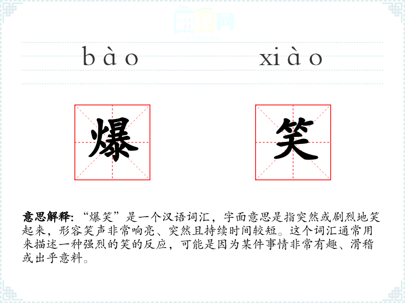 “爆笑”是一个汉语词汇,字面意思是指突然或剧烈地笑起来,形容笑声非常响亮、突然且持续时间较短。这个词汇通常用来描述一种强烈的笑的反应,可能是因为某件事情非常有趣、滑稽或出乎意料。