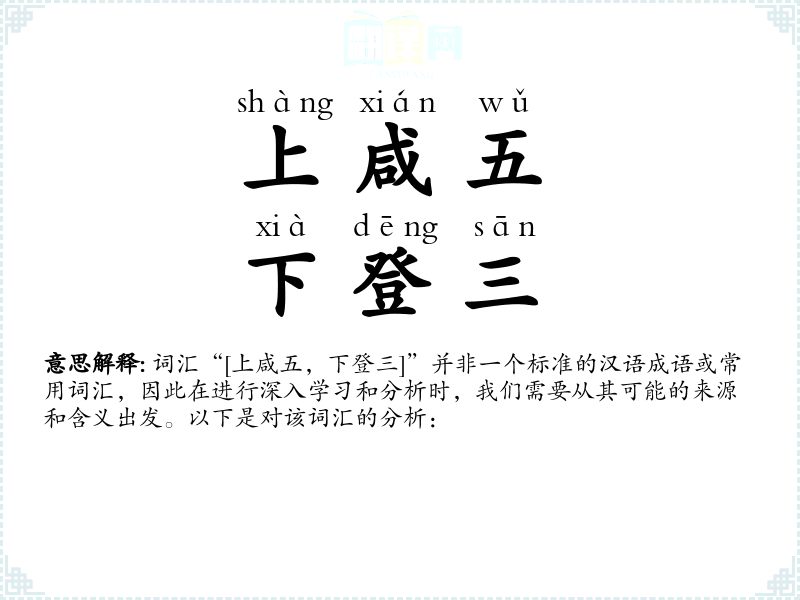 词汇“[上咸五,下登三]”并非一个标准的汉语成语或常用词汇,因此在进行深入学习和分析时,我们需要从其可能的来源和含义出发。以下是对该词汇的分析: