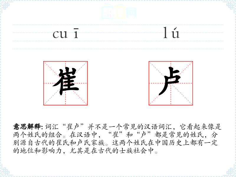 - 同义词:无特定同义词,因为“崔卢”是两个姓氏的组合。
