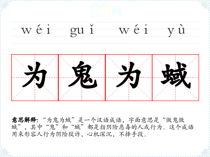 “为鬼为蜮”是一个汉语成语,字面意思是“做鬼做蜮”,其中“鬼”和“蜮”都是指阴险恶毒的人或行为。这个成语用来形容人行为阴险狡诈,心机深沉,不择手段。