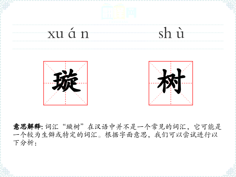 词汇“璇树”在汉语中并不是一个常见的词汇,它可能是一个较为生僻或特定的词汇。根据字面意思,我们可以尝试进行以下分析: