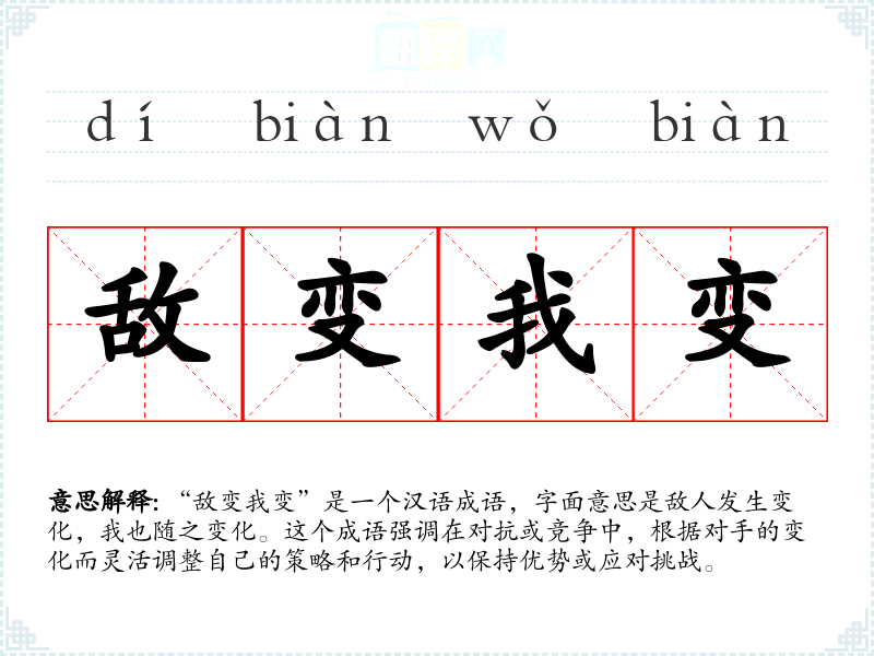 “敌变我变”是一个汉语成语,字面意思是敌人发生变化,我也随之变化。这个成语强调在对抗或竞争中,根据对手的变化而灵活调整自己的策略和行动,以保持优势或应对挑战。