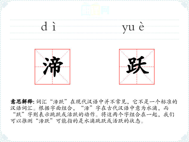 词汇“渧跃”在现代汉语中并不常见,它不是一个标准的汉语词汇。根据字面组合,“渧”字在古代汉语中意为水滴,而“跃”字则表示跳跃或活跃的动作。将这两个字组合在一起,我们可以推测“渧跃”可能指的是水滴跳跃或活跃的状态。