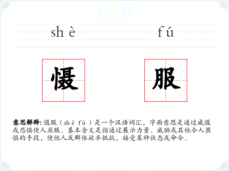 慑服(shè fú)是一个汉语词汇,字面意思是通过威慑或恐惧使人屈服。基本含义是指通过展示力量、威胁或其他令人畏惧的手段,使他人或群体放弃抵抗,接受某种状态或命令。
